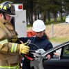 College Paramedic Coordinator/Broomall Fire Company Lieutenant Tim Capuzzi shows EMS-100 student Alexea Patton of Norwood how to use a hydraulic extrication rescue tool.