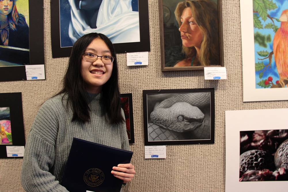 2023 Congressional District Art Competition winner, Isabella Woo, stands proudly next to her drawing.