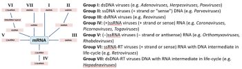 Figure 1: Baltimore classification of viruses based on mechanism of synthesis of mRNA prior to hijacking the host cell for replication, and examples.