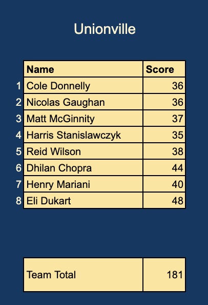 The Unionville boys varsity golf team played Devon Prep Tuesday in a non-league matchup.  The match result was: