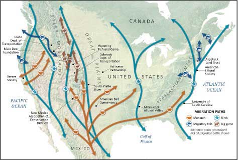 Figure 1: Migrations paths of animals across the North American continent compiled from tracking organizations. From: https://www.nationalparkstraveler.org/2023/01/protecting-migratory-corridors-bottled-wildlife