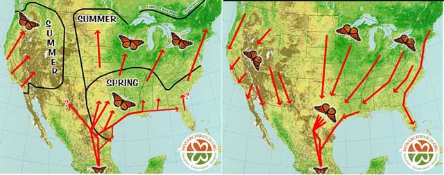 Figure 2: Long-lived overwintering Monarchs initiate spring migrations. Multiple short-lived summer generations eventually arrive at the northernmost boundaries and lay eggs (left panel). The eggs hatch into long-lived fall offspring which migrate south and initiate the following spring movement northwards (right panel). From: https://monarchwatch.org/migration/