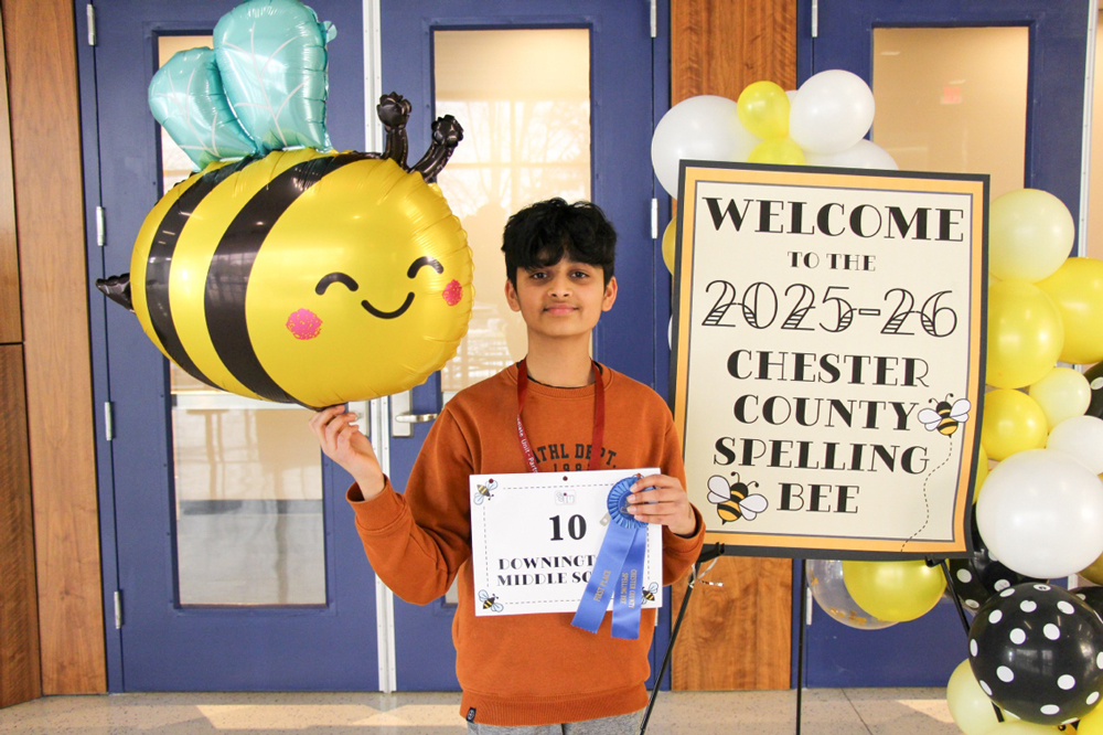 Yohaan Damani of Downingtown Middle School is the first place winner of the 2026 Chester County Spelling Bee that took place on Wednesday, February 11, 2026, at Collegium Performing Arts Center. Yohaan spelled his way to victory with the winning word “predecessor” (P-R-E-D-E-C-E-S-S-O-R). His victory qualifies him to represent the Chester County region this spring at the Scripps National Spelling Bee in Washington, D.C.