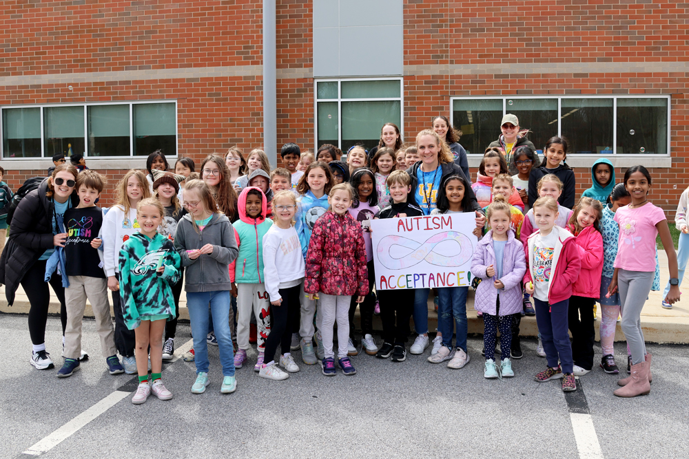 Students at Uwchlan Hills Elementary School gather for the school’s “Bubbles of Kindness” event, promoting messages of kindness for Autism Acceptance Month.