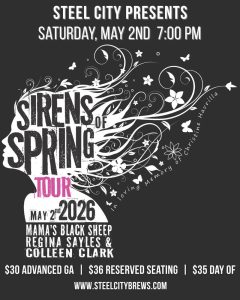 The “Sirens of Spring Tour” showcases women whose voices captivate with enchanting sweetness and power. Listeners will be treated to a night of original music from singer/songwriters Mama’s Black Sheep, Regina Sayles, Colleen Clark.